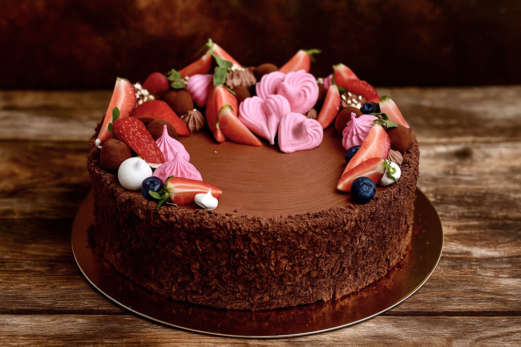 Základ dortu tvoří čokoládový krém a kakaové korpusy. Dort je zalitý vynikající belgickou čokoládou, dozdobený čokoládkami, krémovými pusinkami a čerstvým ovocem. Po bocích je dort dozdoben strouhanou hořkou čokoládou.